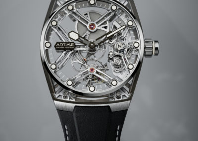 Le modèle inaugural ART01 contient tous les principes qu’Artime a choisis pour siens toucher les clients les plus exigeants au coeur, en toute transparence, avec une mise en scène de matières, de volumes, de concepts innovants et de finitions d’un niveau hors normes. Cette pièce est composée d’un calibre aérien en or gris, d’un tourbillon à double spiral et d’un sélecteur de fonction ergonomique, intimement intégré à une boite où titane et saphir transparent s’entremêlent. Une première série limitée de vingt exemplaires d’ART01 en titane vient poser de manière claire et ultra-moderne les principes de haute horlogerie contemporaine d’Artime.
